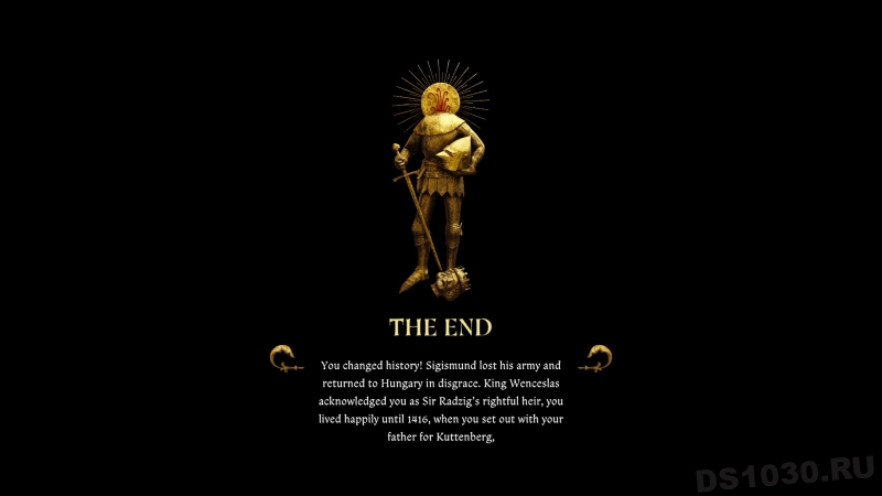 «Сигизмунд лишился армии и с позором вернулся в Венгрию. Вацлав признал вас законным наследником пана Радцига. Вы жили счастливо до 1416 года, после чего с отцом отправились в Куттенберг», — гласит новая концовка.